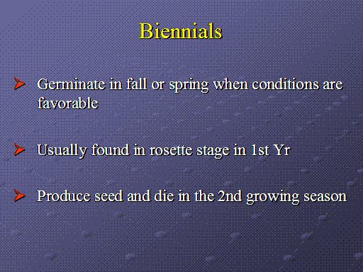 Biennials<BR> <BR>Germinate in fall or spring when conditions are favorable <BR> <BR>Usually found in rosette stage in 1st Yr <BR> <BR>Produce seed and die in the 2nd growing season<BR>