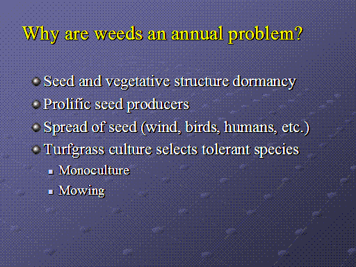 Why are weeds an annual problem?<BR>Seed and vegetative structure dormancy <BR>Prolific seed producers <BR>Spread of seed (wind, birds, humans, etc.) <BR>Turfgrass culture selects tolerant species <BR>Monoculture <BR>Mowing <BR>