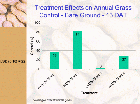 Treatment Effects on Annual Grass Control - Bare Ground - 13 DAT<BR>LSD (0.10) = 22 <BR>*Averaged over all nozzle types<BR>