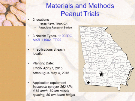 Materials and Methods Peanut Trials<BR>2 locations <BR>Ponder Farm, Tifton, GA <BR>Attapulgus Research Station <BR> <BR>3 Nozzle Types- 11002DG, AIXR 11002, TTI02 <BR> <BR>4 replications at each location <BR> <BR>Planting Date: <BR>	Tifton- Apr 27, 2015 <BR>	Attapulgus- May 4, 2015 <BR> <BR>Application equipment-    backpack sprayer 262 kPa, 4.83 km/h, 50-cm nozzle spacing, 50-cm boom height<BR>