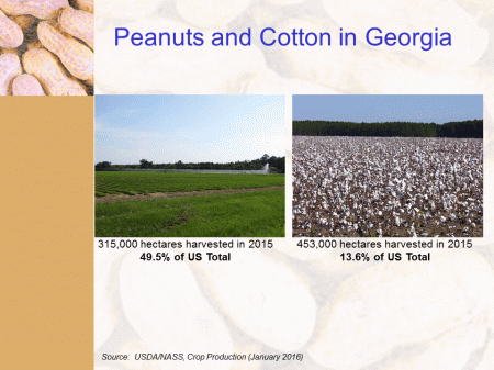 Peanuts and Cotton in Georgia<BR>315,000 hectares harvested in 2015 <BR>49.5% of US Total<BR>453,000 hectares harvested in 2015 <BR>13.6% of US Total<BR>Source:  USDA/NASS, Crop Production (January 2016)<BR>
