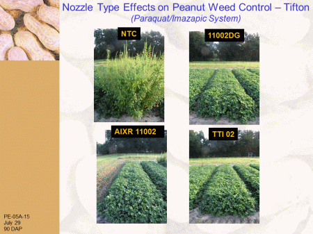 Nozzle Type Effects on Peanut Weed Control – Tifton (Paraquat/Imazapic System)<BR>PE-05A-15 <BR>July 29 <BR>90 DAP<BR>NTC<BR>11002DG<BR>AIXR 11002<BR>TTI 02<BR> <BR>