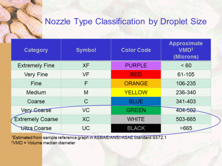 Nozzle Type Classification by Droplet Size<BR>1Estimated from sample reference graph in ASBAE/ANSI/ASAE Standard S572.1 <BR>2VMD = Volume median diameter<BR>