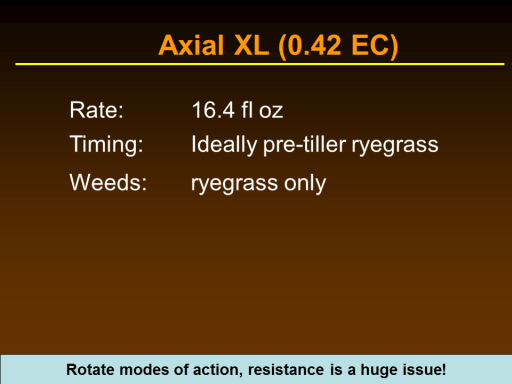 Axial XL (0.42 EC)  <BR> <BR>Rate:	16.4 fl oz <BR>Timing:	Ideally pre-tiller ryegrass <BR>Weeds:	ryegrass only <BR> <BR>Rotate modes of action, resistance is a huge issue!<BR>