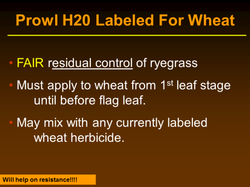<BR> FAIR residual control of ryegrass <BR> Must apply to wheat from 1st leaf stage 	until before flag leaf. <BR> May mix with any currently labeled 	wheat herbicide.<BR>Prowl H20 Labeled For Wheat<BR>Will help on resistance!!!!<BR>