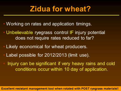 Working on rates and application timings. <BR> Unbelievable ryegrass control IF injury potential 	does not require rates reduced to far? <BR> Likely economical for wheat producers. <BR> Label possible for 2012/2013 (limit use). <BR>  Injury can be significant if very heavy rains and cold 	conditions occur within 10 day of application.<BR>Zidua for wheat?<BR>Excellent resistant management tool when rotated with POST ryegrass materials!!<BR>