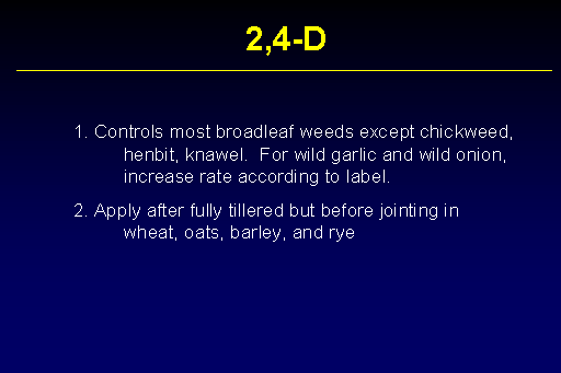 <BR>	1. Controls most broadleaf weeds except chickweed, 			henbit, knawel.  For wild garlic and wild onion, 			increase rate according to label.
