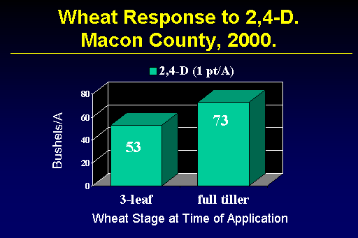 Wheat Response to 2,4-D. Macon County, 2000.<BR>73<BR>53<BR>Wheat Stage at Time of Application<BR>Bushels/A<BR>