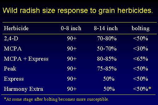 Wild radish size response to grain herbicides.<BR>Herbicide	       		0-8 inch	   8-14 inch 	bolting