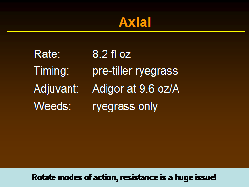 Axial  <BR> <BR>Rate:	8.2 fl oz <BR>Timing:	pre-tiller ryegrass <BR>Adjuvant:	Adigor at 9.6 oz/A <BR>Weeds:	ryegrass only <BR> <BR>Rotate modes of action, resistance is a huge issue!<BR>
