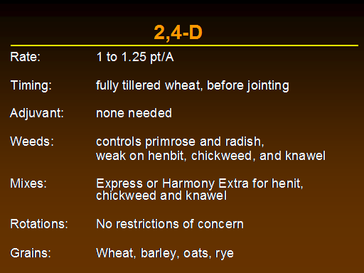 2,4-D  <BR>Rate:	1 to 1.25 pt/A <BR>	 <BR>Timing:	fully tillered wheat, before jointing <BR> <BR>Adjuvant:	none needed <BR> <BR>Weeds:	controls primrose and radish,             	weak on henbit, chickweed, and knawel <BR> <BR>Mixes:	Express or Harmony Extra for henit, 	chickweed and knawel <BR> <BR>Rotations:	No restrictions of concern <BR> <BR>Grains:	Wheat, barley, oats, rye<BR>