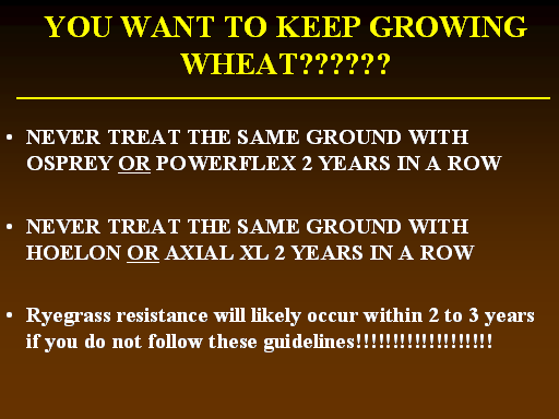 YOU WANT TO KEEP GROWING WHEAT??????<BR>NEVER TREAT THE SAME GROUND WITH OSPREY OR POWERFLEX 2 YEARS IN A ROW <BR> <BR>NEVER TREAT THE SAME GROUND WITH HOELON OR AXIAL XL 2 YEARS IN A ROW <BR> <BR>Ryegrass resistance will likely occur within 2 to 3 years if you do not follow these guidelines!!!!!!!!!!!!!!!!!!!<BR>