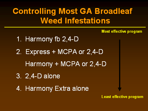 Controlling Most GA Broadleaf Weed Infestations <BR> <BR>		1.  Harmony fb 2,4-D <BR>		2.  Express + MCPA or 2,4-D <BR>		     Harmony + MCPA or 2,4-D <BR>		3.  2,4-D alone <BR>		4.  Harmony Extra alone<BR>Most effective program<BR>Least effective program<BR>