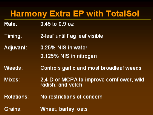 Harmony Extra EP with TotalSol  <BR>Rate:	0.45 to 0.9 oz <BR>	 <BR>Timing:	2-leaf until flag leaf visible <BR> <BR>Adjuvant:	0.25% NIS in water <BR>	0.125% NIS in nitrogen <BR> <BR>Weeds:	Controls garlic and most broadleaf weeds <BR> <BR>Mixes:	2,4-D or MCPA to improve cornflower, wild 	radish, and vetch <BR> <BR>Rotations:	No restrictions of concern <BR> <BR>Grains:	Wheat, barley, oats<BR>
