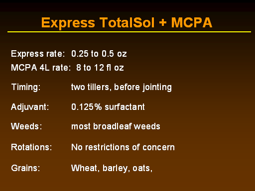 Express TotalSol + MCPA  <BR> <BR>Express rate:	0.25 to 0.5 oz <BR>MCPA 4L rate:	  8 to 12 fl oz <BR>	 <BR>Timing:	two tillers, before jointing <BR> <BR>Adjuvant:	0.125% surfactant <BR> <BR>Weeds:	most broadleaf weeds <BR> <BR>Rotations:	No restrictions of concern <BR> <BR>Grains:	Wheat, barley, oats, <BR>