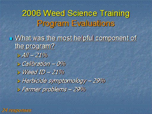 2006 Weed Science Training Program Evaluations<BR>What was the most helpful component of the program? <BR>All – 21% <BR>Calibration – 0% <BR>Weed ID – 21% <BR>Herbicide symptomology – 29% <BR>Farmer problems – 29% <BR>24 responses<BR>