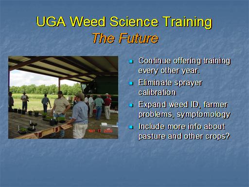 UGA Weed Science Training The Future<BR>Continue offering training every other year. <BR>Eliminate sprayer calibration <BR>Expand weed ID, farmer problems, symptomology <BR>Include more info about pasture and other crops?<BR>