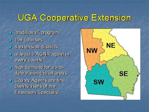 UGA Cooperative Extension<BR>“traditional” program <BR>159 counties <BR>4 extension districts <BR>at least 1 AGNR agent in every county <BR>high demand for up-to-date training in all areas <BR>County Agents are first clients/users of the Extension Specialist<BR>