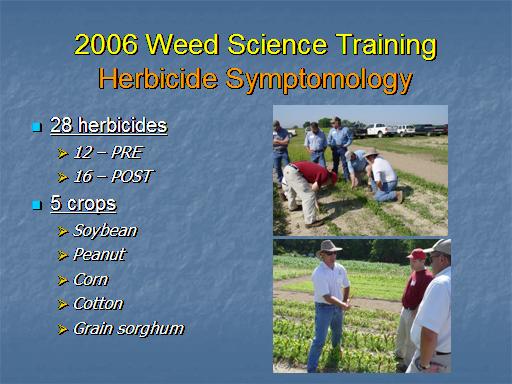 2006 Weed Science Training Herbicide Symptomology<BR>28 herbicides <BR>12 – PRE <BR>16 – POST <BR>5 crops <BR>Soybean <BR>Peanut <BR>Corn <BR>Cotton <BR>Grain sorghum <BR>