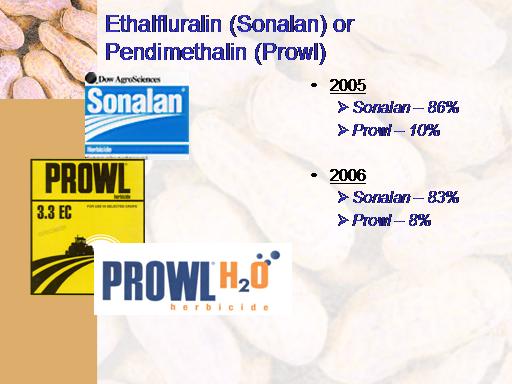 Ethalfluralin (Sonalan) or Pendimethalin (Prowl)<BR>2005 <BR>Sonalan – 86% <BR>Prowl – 10% <BR> <BR>2006 <BR>Sonalan – 83% <BR>Prowl – 8%<BR>