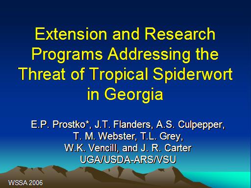 Extension and Research  Programs Addressing the Threat of Tropical Spiderwort in Georgia<BR>E.P. Prostko*, J.T. Flanders, A.S. Culpepper,  <BR>T. M. Webster, T.L. Grey,  <BR>W.K. Vencill, and J. R. Carter <BR>UGA/USDA-ARS/VSU<BR>WSSA 2006<BR>