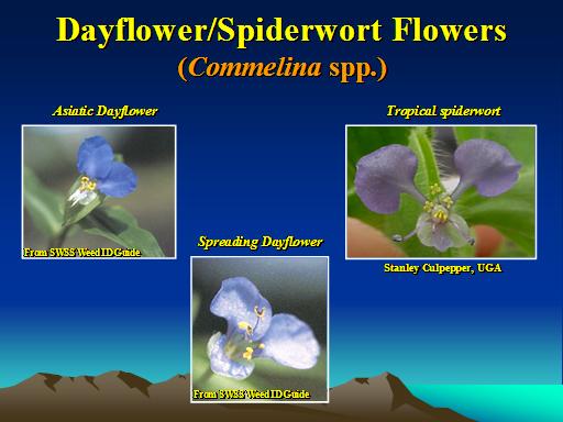 Dayflower/Spiderwort Flowers (Commelina spp.)<BR>Asiatic Dayflower<BR>Spreading Dayflower<BR>Tropical spiderwort<BR>From SWSS Weed ID Guide<BR>From SWSS Weed ID Guide<BR>Stanley Culpepper, UGA<BR>