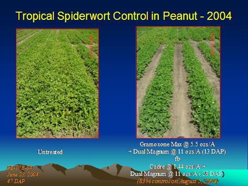 Tropical Spiderwort Control in Peanut - 2004<BR>PE-07B-04 <BR>June 23, 2004 <BR>47 DAP <BR>Untreated<BR>Gramoxone Max @ 5.5 ozs/A <BR>+ Dual Magnum @ 11 ozs/A (13 DAP) <BR>fb <BR>Cadre @ 1.44 ozs/A + <BR>Dual Magnum @ 11 ozs/A ( 28 DAP) <BR>(83% control on August 5, 2004)<BR>