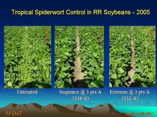Tropical Spiderwort Control in RR Soybeans - 2005<BR>Untreated<BR>Sequence @ 3 pts/A <BR>($16/A) <BR>(Glyphosate + Dual Magnum)<BR>Extreme @ 3 pts/A <BR>($12/A) <BR>(Glyphosate + Pursuit)<BR>33 DAT<BR>Applied 20 DAP<BR>