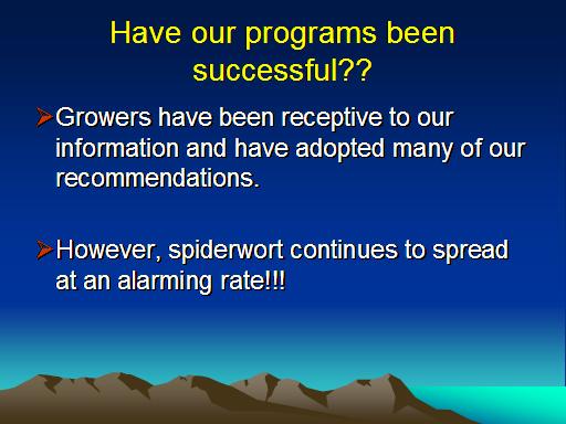Have our programs been successful??<BR>Growers have been receptive to our  information and have adopted many of our recommendations. <BR> <BR>However, spiderwort continues to spread at an alarming rate!!!<BR>